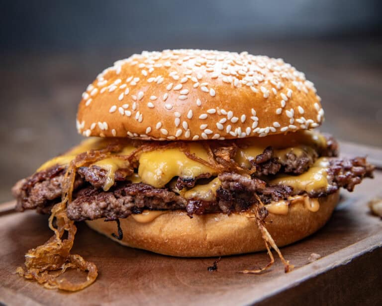 Özel El Yapımı Köfte, Cheddar Peyniri, Karamelize Sogan, Barbekü Sos, Patates Cips Ve Özel Sos Ile Servis Edilir.